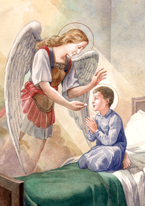Il dono del pane bianco lo aveva indotto a scoprire un altro pane, anchesso bianco, benché più piccolo. Lo scorgeva in chiesa, alla messa, quando i fedeli si accostavano alla balaustra. Qui aveva capito anzitempo che si trattava di Gesù. Andò anch’egli una mattina, ma il prete lo vide piccolo e lo rimandò a sedere. A otto anni, in quel tempo, si era piccoli per leucarestia, ma Gerardo sera incamminato da tempo verso la conoscenza del suo Signore. Le lacrime versate in chiesa continuarono a bagnare il lettino scarno della sua povera stanzetta. Il prete aveva detto no, ma Gesù avrebbe risposto sì al suo piccolo amico. Di notte gli inviò l’arcangelo Michele a porgergli il pane consacrato. Al mattino seguente, felice e trionfante, confessava candidamente: «Ieri il prete mi ha rifiutato la comunione, questa notte larcangelo san Michele me l’ha portata». Anche questo episodio, apparentemente fantastico, verrà confermato dallo stesso Gerardo ventanni dopo.